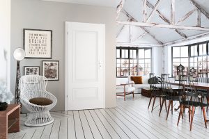 Odsąoni©te krokwie podkreėl• surowy charakter aranĺacji wabi-sabi. Na zdj©ciu drzwi Ancona od Classen
