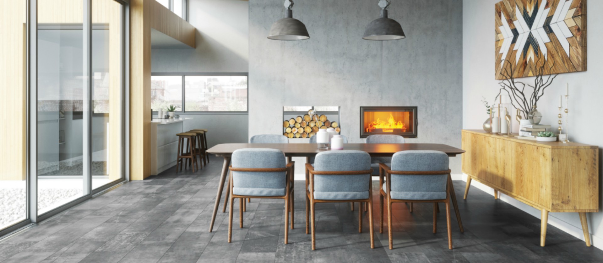 Restraint is also maintained with regard to the accessories – windows often lack curtains, and carpets rarely appear on the floor. The choice of suitable panels or parquet is therefore crucial. Planks resembling stone or concrete from Visiogrande line will be a good choice here. The classic shape of the tiles and the natural structure will greatly emphasize the rigidity of the rooms. The panels from Galaxy 4V and Adventure 4V collections, which resemble genuine wooden floors, will also be a good choice. In order to slightly warm the interior, planks with a Moroccan motif (Loft Cerama) or with chevron pattern (Loft Artisan) can be introduced.