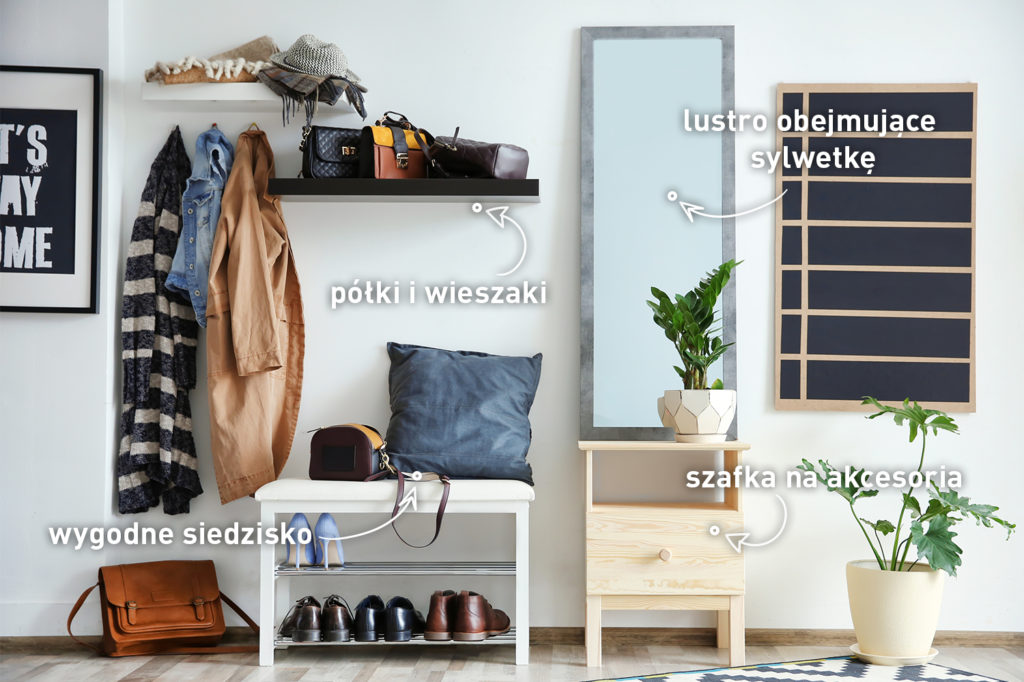Nie rezygnuj jednak z szafki na buty – rozrzucone po podłodze szpilki, botki czy sandały tworzą nieład, dlatego nie powinny być na widoku. Możesz kupić wąski i podłużny mebel, który ustawiony przy ścianie nie będzie blokować przejścia, a wyposażony dodatkowo w siedzisko ułatwi codzienne szykowanie się do wyjścia z domu. Przyda Ci się również drobna szafka na akcesoria, takie jak klucze, okulary słoneczne czy zestaw do pielęgnacji obuwia.